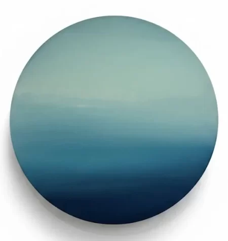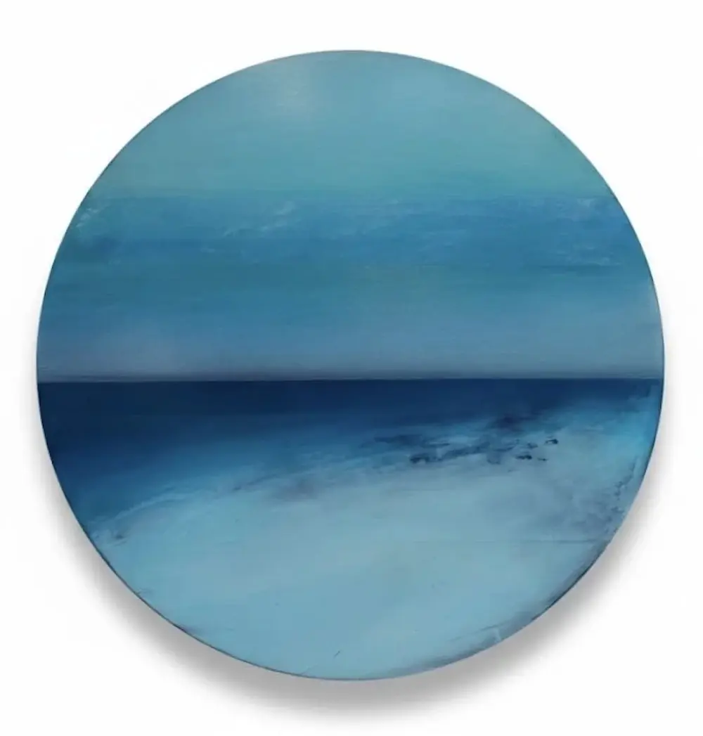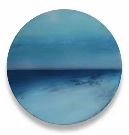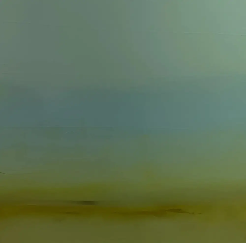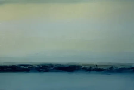 Environmental information cycles through us daily informing us about ourselves and our relationship with the surrounding natural world. In painting these atmospheric works on panel, I continue a dialogue about such things with myself. Transitioning hues of oil color drift across and down the panels to disappear behind horizons, falling into land and sea. The air is water, and water becomes air. The illusion of evaporation and condensation hangs in a horizontal balance above and below, only to be contained by landmass capturing its elusive shadows of light and color at the outer edges of the compositions. Dark rises to light and the light returns into the motion of tidal flow, and shoreline breaks at the water’s edge.