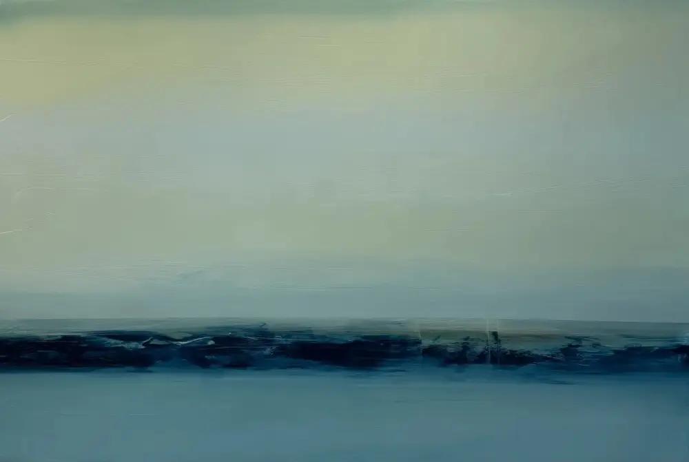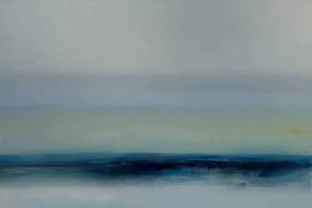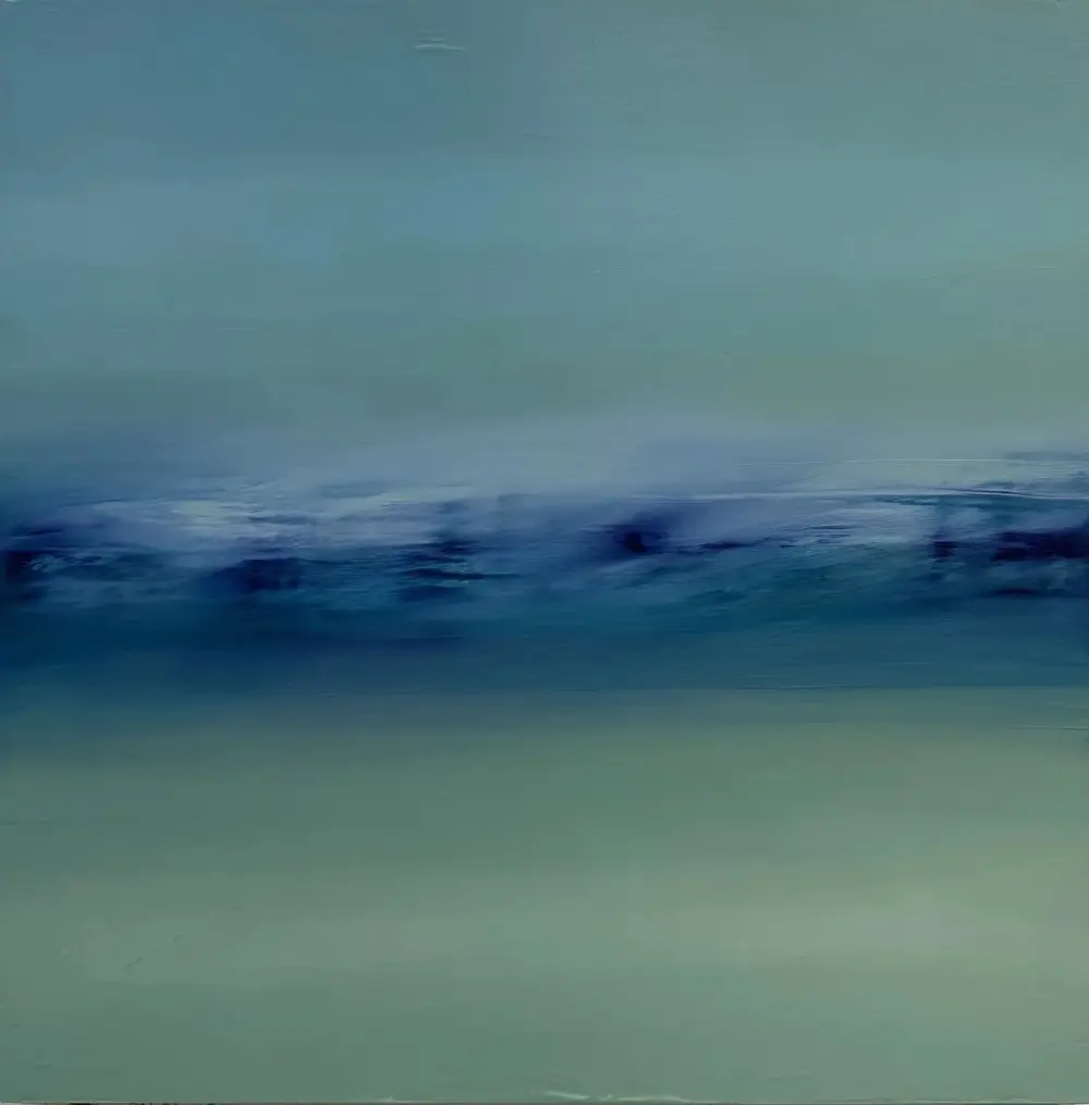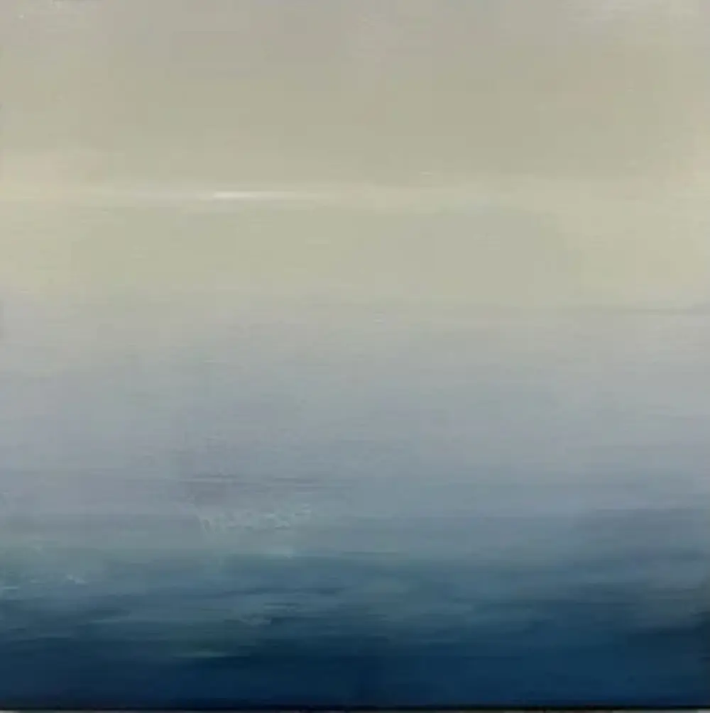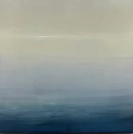 Color and texture give language to these atmospheric compositions and described the emotions I feel when painting them. The hue of the color palette shifts top to bottom throughout each of the pieces. Deep blue blacks bubble up from below the ocean’s surface and rise, evaporating into the lightness of tinted whites of air and clouds. The softness of the graying white clouds dissipates and washes across a silver sky harkening to memories I have of rainstorms over the vast ocean. Sun colors radiate through the white precipitation forming pale pastel greens, blues, and blush tones: the colors of winter sunsets across the horizon.